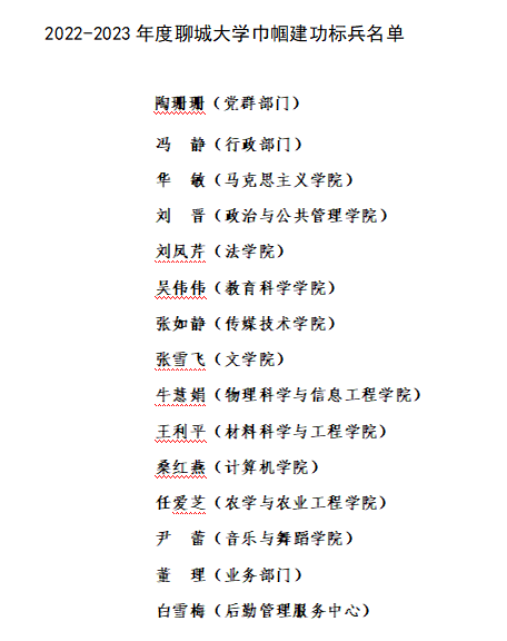 为激励先进,树立典型,推进工作,根据上级有关文件和《关于评选表彰第七届聊城大学工会先进集体、工会先进工作者的通知》(聊大工发〔2023〕3号)、《关于评选表彰聊城大学巾帼建功标兵岗、巾帼建功标兵的通知》(聊大工发〔2023〕4号)精神,工会(妇委会)于2023年12月至2024年1月在全校开展了2022-2023年度聊城大学工会先进集体、巾帼建功标兵岗、工会先进工作者、巾帼建功标兵评选活动。经各二级工会民主推荐、校工会主席办公会研究,征求纪检监察机构意见,决定授予马克思主义学院工会等8个二级工会“2022-2023年度聊城大学工会先进集体”荣誉称号;授予聊城大学新闻中心(聊城大学融媒体中心)等8个集体“2022-2023年度聊城大学巾帼建功标兵岗”荣誉称号;授予赵昌涛等15名同志“2022-2023年度聊城大学工会先进工作者”荣誉称号;授予陶珊珊等15名同志“2022-2023年度聊城大学巾帼建功标兵”荣誉称号。